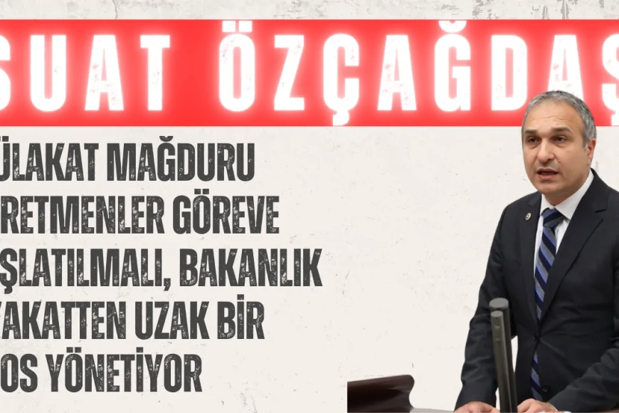 TBMM Genel Kurulu’nda CHP Grubu adına konuşan CHP Genel Başkan Yardımcısı ve İstanbul Milletvekili Suat Özçağdaş, Millî Eğitim Bakanlığı’nın öğretmen atamaları ve proje okullar konusundaki politikalarını eleştirdi. Özçağdaş, atama bekleyen yüz binlerce öğretmenin mağdur edildiğini, sistemin liyakatsizlik ve keyfî tercihlerle yönetildiğini söyledi.