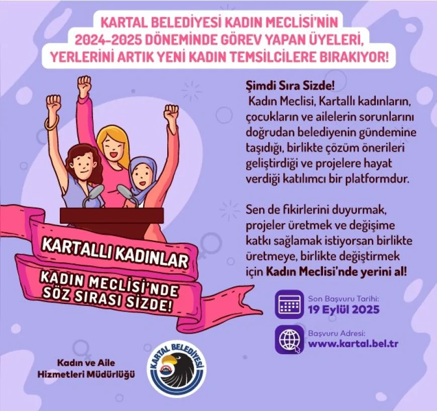 Kadın Meclisi’ne katılmak isteyen adaylar, Kartal Belediyesi’nin resmi internet sitesi www.kartal.bel.tr üzerinden başvuru yapabilecek. Son başvuru tarihi 19 Eylül 2025 olarak duyuruldu.