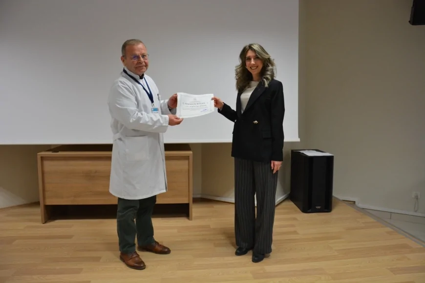 Konuşmanın sonunda, Başhekim Prof. Dr. Zafer Ergül, Arş. Gör. Dr. Ayça Gökdemir’e katkılarından dolayı Teşekkür Belgesi takdim etti.